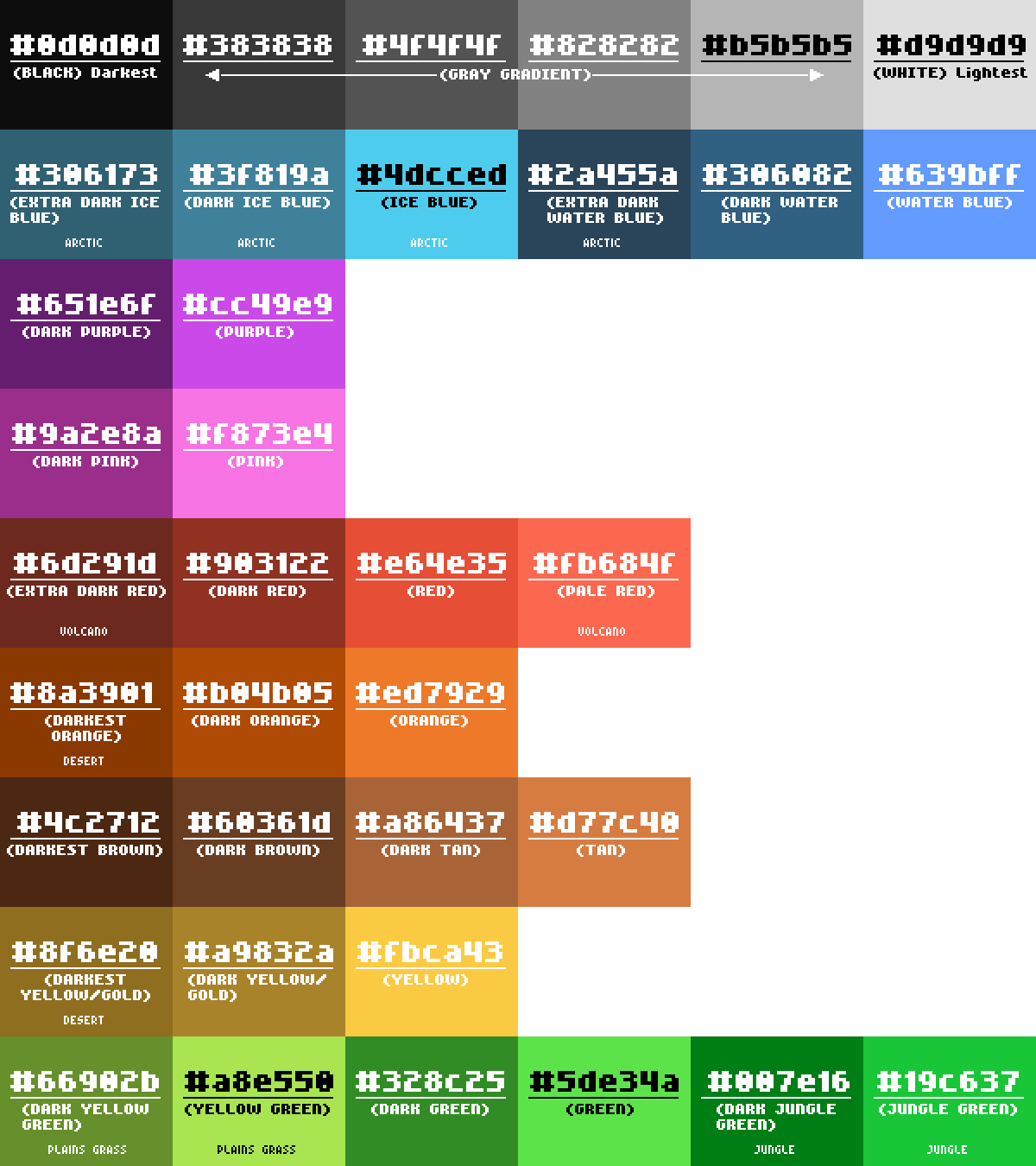 This visual pallete image goes with a text document including all the hex codes for ease of use. Very helpful for all devs, but in particular those who are color blind.