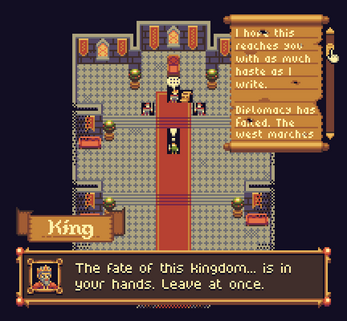I see High Birth used in some screenshots, and Font Fantasy would also work. Another smaller font is also used in dialogues, maybe it is Micro Chat. v3x3d has multiple nice ones that fit inside 8x8 to keep the tile resolution homogeneous, so we get to pick one we like!
